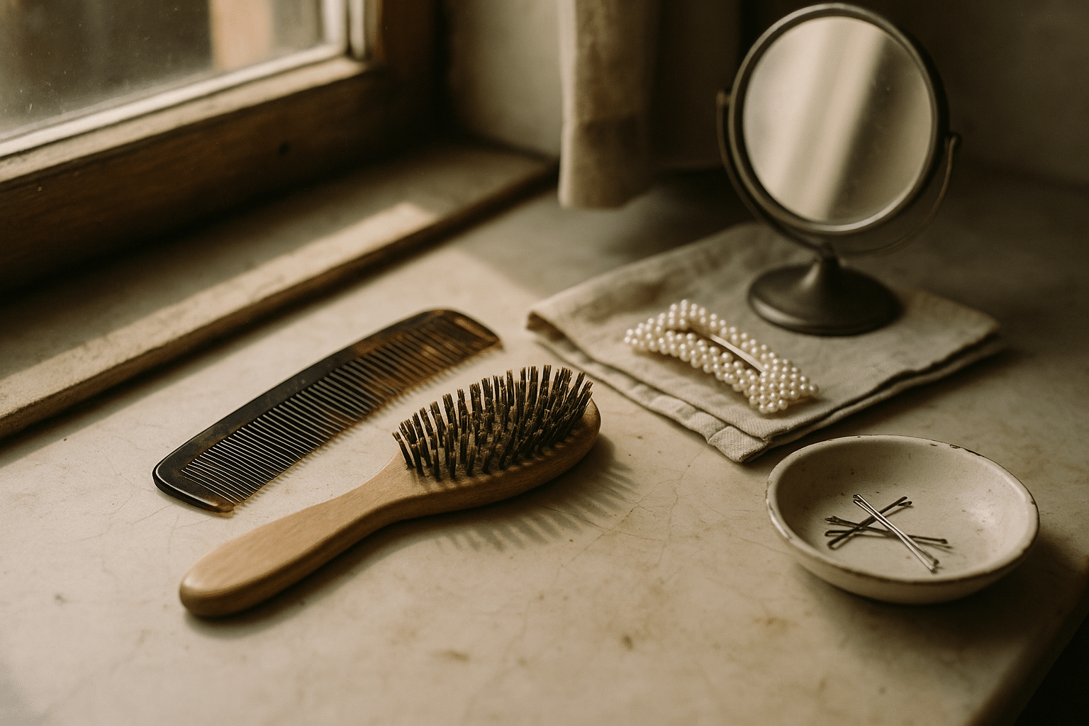 – Neutral clips and barrettes anchor side parts and create lift at the temple.